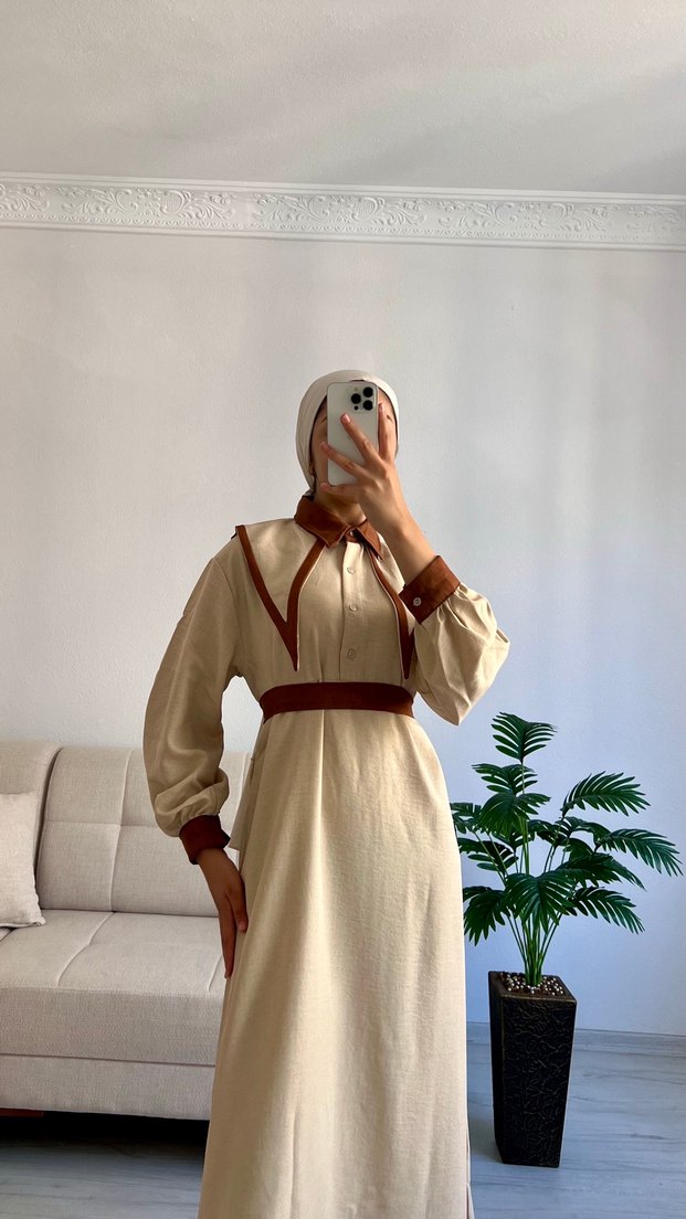 Kemerli, yakalı ve uzun kollu bu uzun elbise, hafif pamuklu kumaştan yapılmıştır. Etnik desen detaylarıyla sade ve rahat bir görünüm sunar.