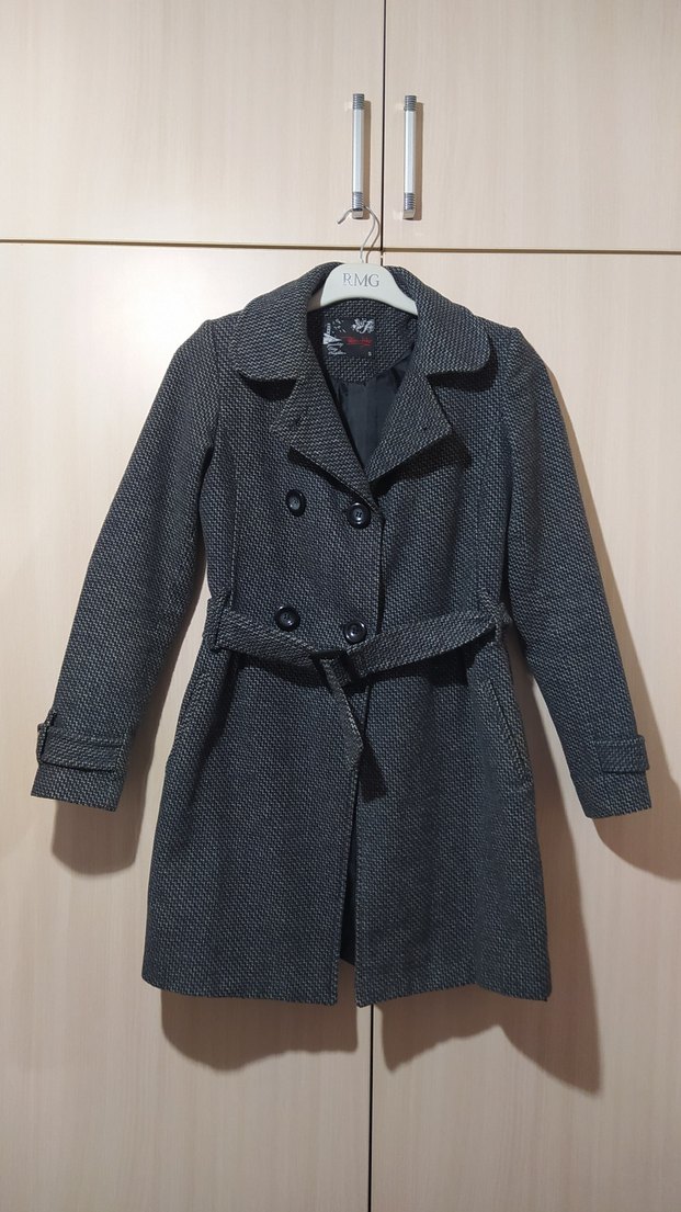 Kemerli ve çift düğmeli, uzun kollu klasik yaka gri kaban, dokulu kumaştan üretilmiştir.