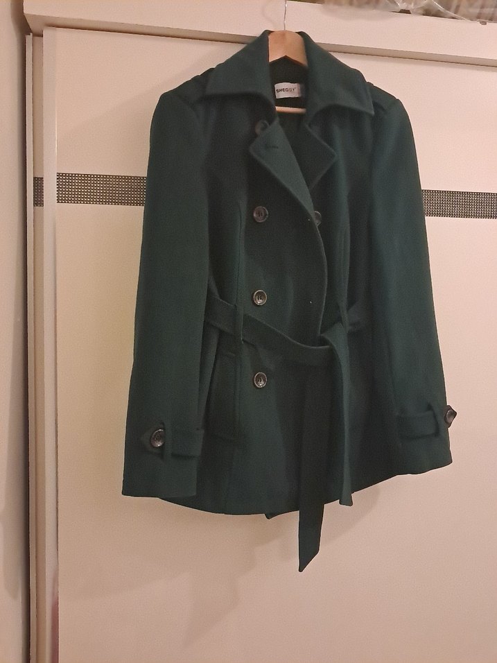 Kemerli, çift düğmeli koyu yeşil kaban. Uzun kollu ve klasik yakalı, yumuşak ve sıcak kumaştan üretilmiştir.