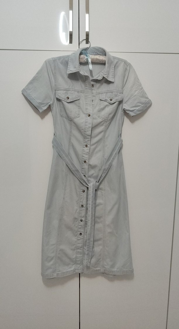 denim midi elbise, kısa kollu ve yakalıdır. Kemer detayıyla belinizi sarar, günlük rahat stil için uygundur.
