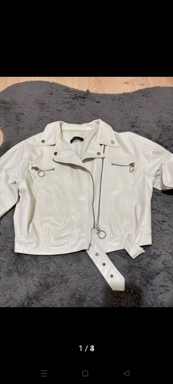 Kemerli bel, fermuarlı cepler ve yakalı kısa kesim beyaz deri ceket. İnce kesimi ve askılı kollarıyla trend casual tarzı için uygun.