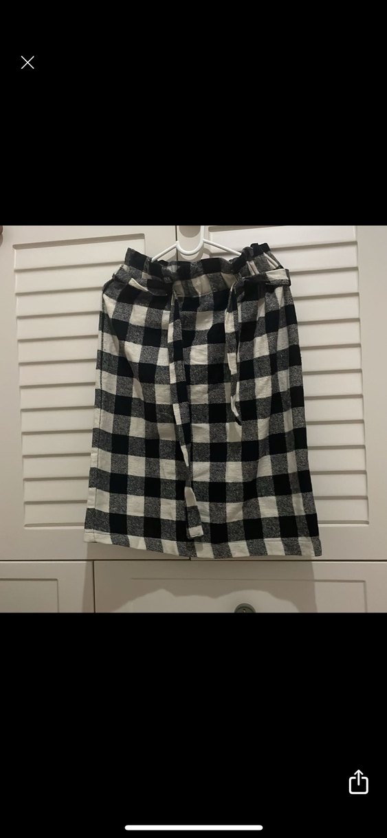 Kemerli bel ve gri ekose desenli bol kesim kız eteği. Pamuklu yumuşak kumaştan, rahat sokak stiline uygun.
