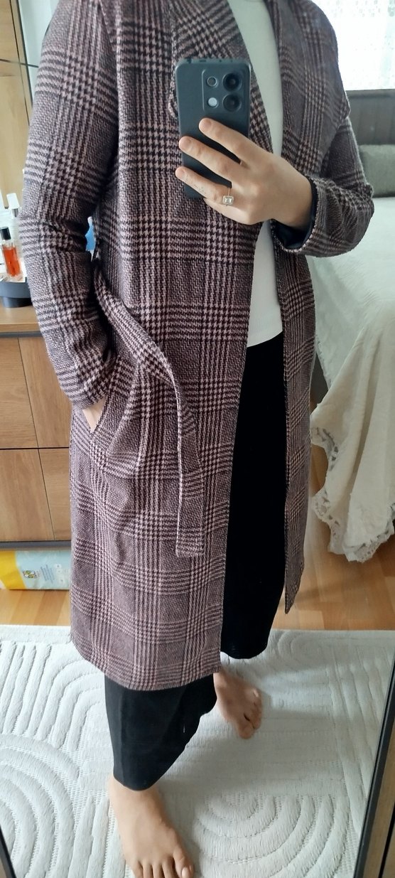 Kemerli, ekose desenli kadın midi kaban, yumuşak yün kumaştan, siyah ve pembesi tonlarında, uzun kollu ve regular fit modeldir.