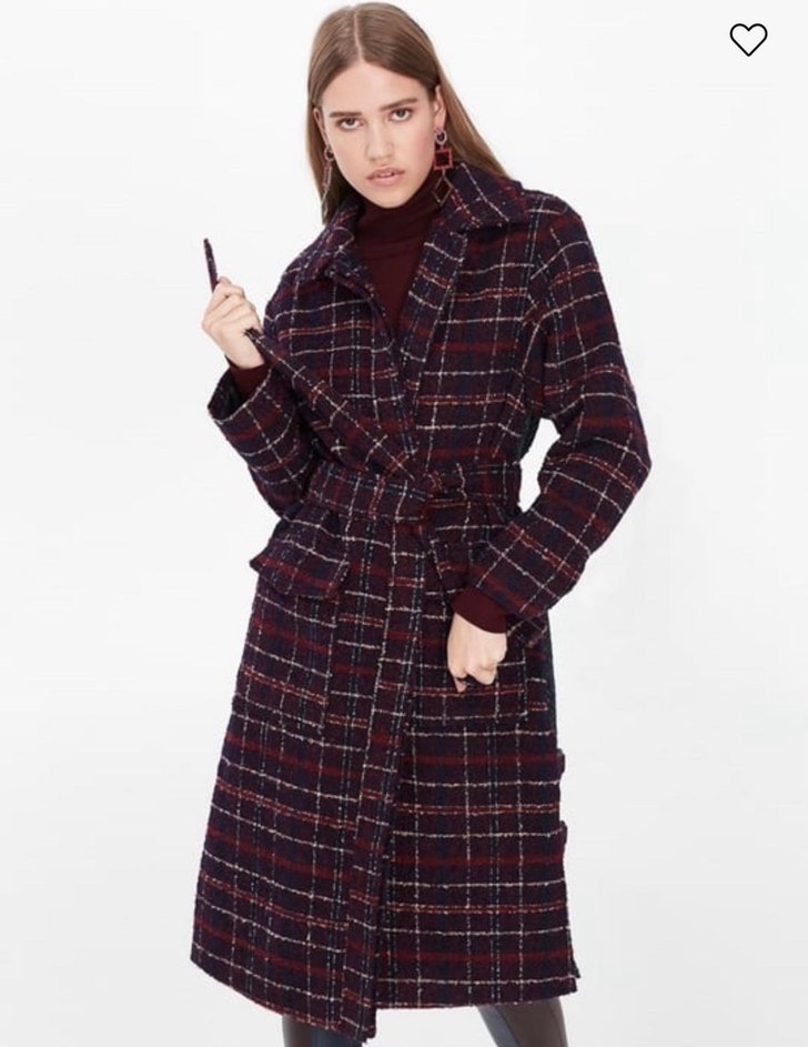 Ekose desenli, kemerli uzun kaban. Klasik yaka ve ön ceplere sahiptir. Soğuk günler için uygundur.