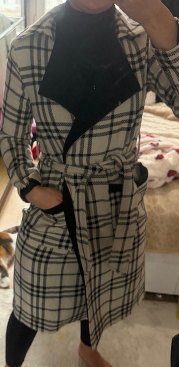 Uzun kesim, kemerli ve ekoseli desenli kadın kaban. Sentetik kumaştan, kesimi dar ve yakası kesik. Günlük rahat sokak stili için uygun. Trendyol trençkot, kol boyu uzunluğu omuzdan itbaren 74 cm , trençkot uzunluğu 105 cm