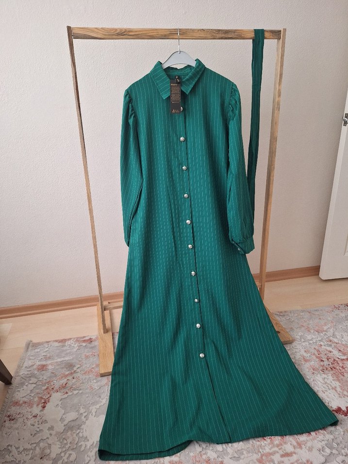Ürün sıfırdır. 38-40 beden uyumlu olup zümrüt yeşili çizgili modele sahiptir. Kemeri vardır. Önünde dügmeleri mevcuttur. Elbise boy 146 cm'dir. İki koltuk arası 51 cm'dir. Alıcısına hayırlı olsun