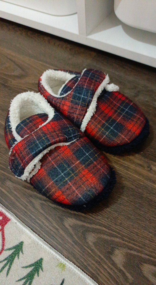 Kemerli askısı ve renkli kırmızı ekose deseniyle erkek çocuklar için sıcak ev terlikleri. Yumuşak ve sıcak kumaşla kaplıdır. 25/26 no