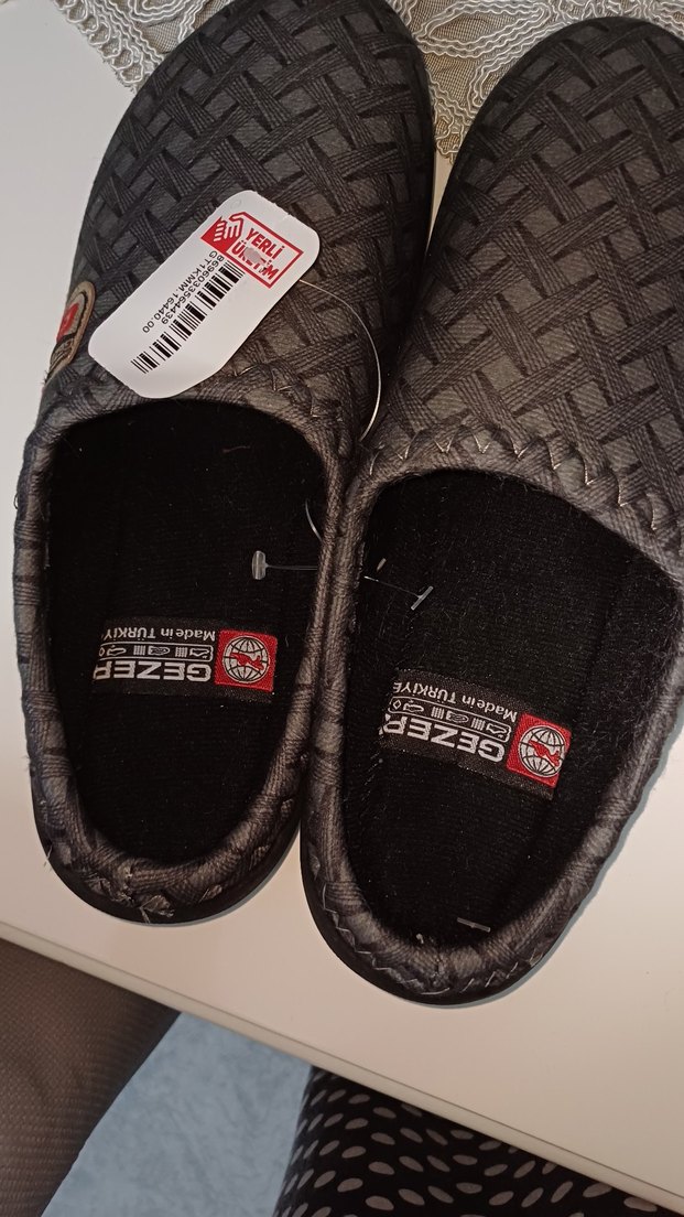 Kemer detaylı, koyu gri desenli erkek ev terliği. Yumuşak iç yüzey ve dayanıklı tabanla sokak stilini konforla birleştirir.