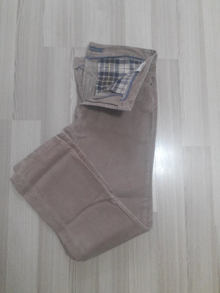 Yumuşak pamuk kumaştan, kemerli, kahverengi fitilli erkek pantolon. Normal boy ve rahat kesim, günlük kullanıma uygun sade tasarım.