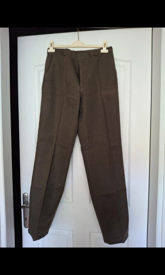 Kemerli, normal boy, kahverengi keten erkek pantolon. İş ortamına uygun, desen içermeyen, trend ve rahat bir tarz sunar.