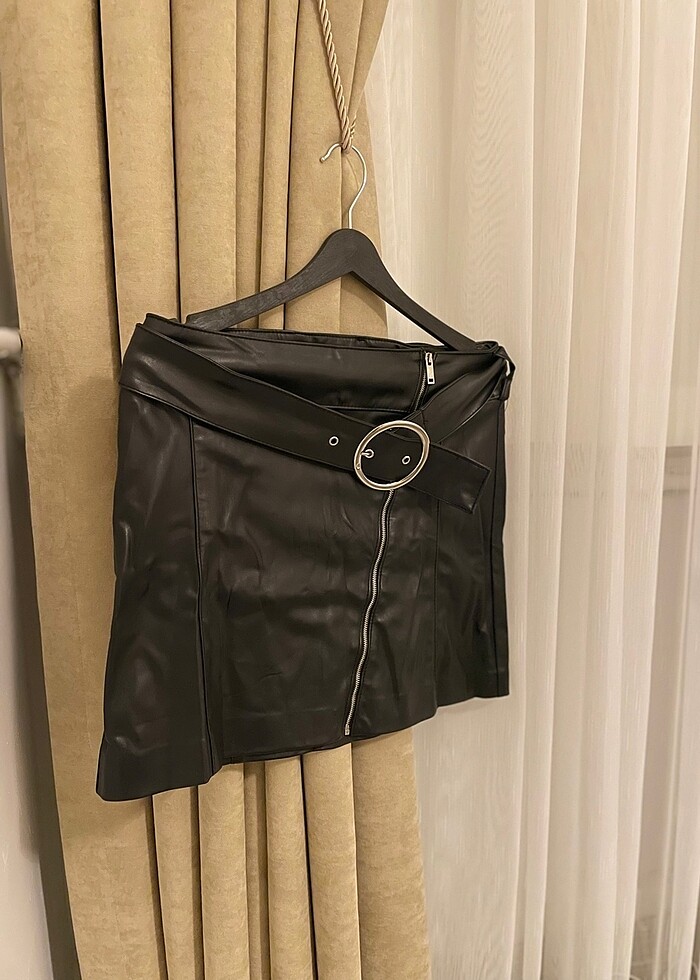 Kemerli fermuar detaylı deri etek