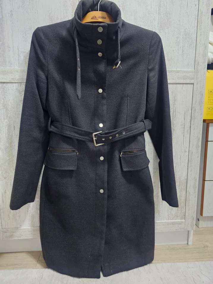 Yüksek yakalı, düğmeli füme kaban. Bel kemeri ve fermuarlı cepleri bulunur. Serin havalar için uygun.
