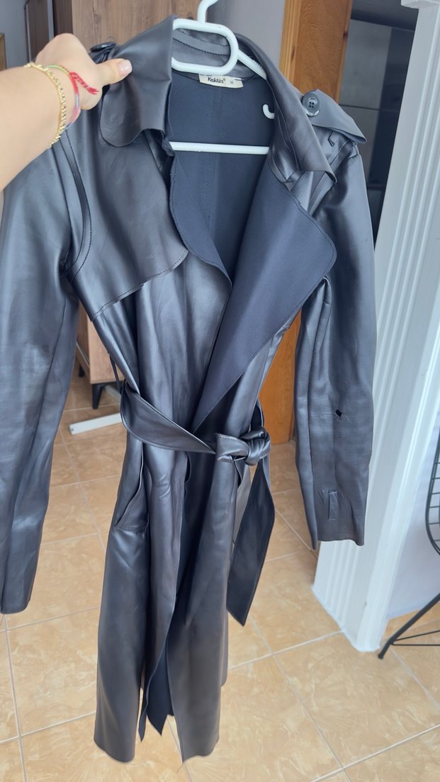 Kemerli bel ve keskin yakalı, uzun kollu gri deri kadın trençkot. Düz ve şık tasarımı ofis kullanımı için uygundur. (Kolunda bi delik var sadece )