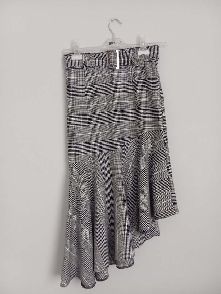 Kemerli beli ve asimetrik etek ucu olan gri ekose etek, sentetik kumaştan ve regular kesimlidir, sokak stiline uygundur.
