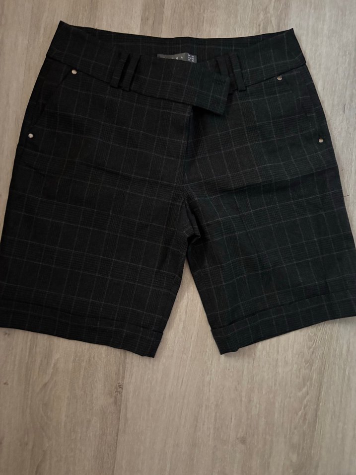 Kadınlar için kemerli, koyu gri ekose desenli bermuda şort. Sentetik kumaştan, ofis ve sokak stili için uygun, rahat kesim.