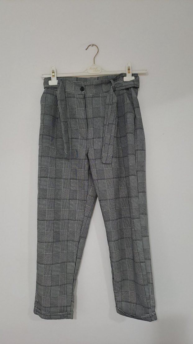Kemerli Gri Ekose Kumaş Pantolon