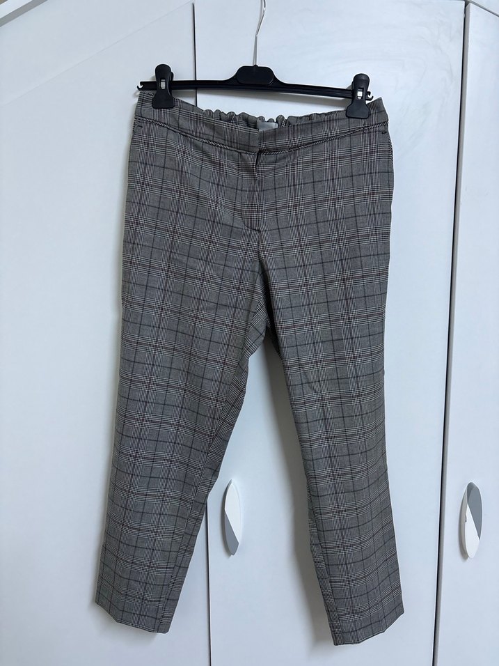 Kemerli bel, gri ekose desenli kumaş pantolon. Normal boy, regular fit, ofis ve günlük tarz için uygun. Sentetik kumaştan üretilmiştir.