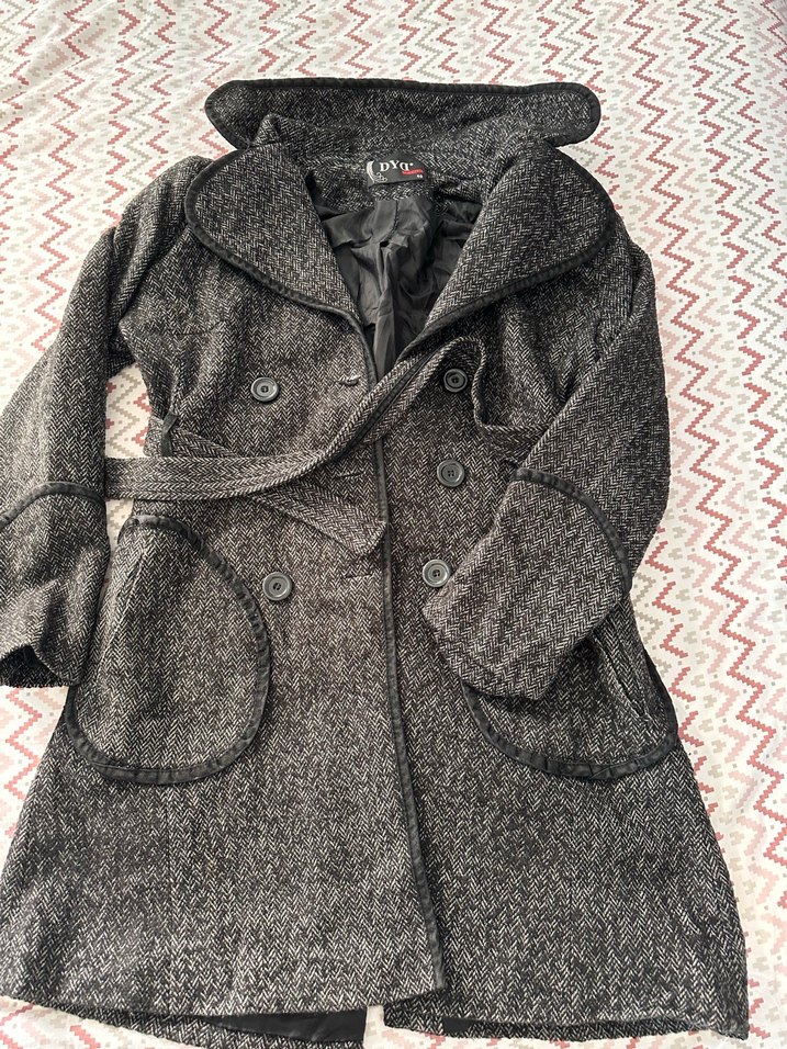 Yumuşak dokulu kumaştan, kemerli ve çift düğmeli kadın kabanı. Geniş yakası ve büyük ön cepleri bulunur. slimfittir belden oturtmali