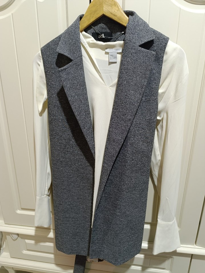 Gri, kemerli ve kolsuz olan bu yelek, notlu yakası ve midi boyuyla ofis ve günlük kullanıma uygundur. Sentetik kumaştan yapılmıştır. gömlek dahil gömlek markası hm 38 beden