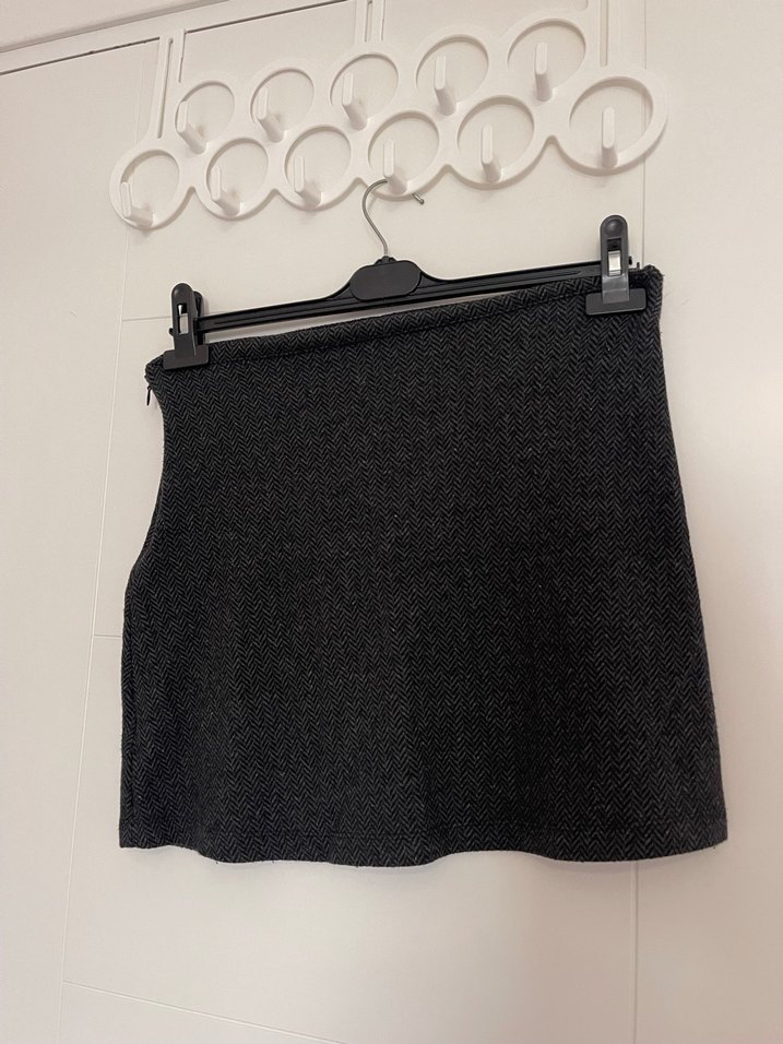 Kemerli, kısa ve fitted kesim gri mini yün etek, yumuşak ve rahat kumaştan üretilmiştir. Günlük sokak stiline uygundur.