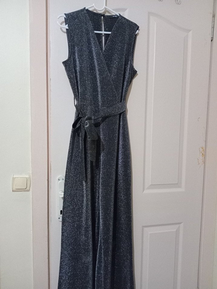 Kolsuz, V yakalı ve kemerli bu uzun abiye tulum, gri renkte ve regular fit kesimdedir. Çağdaş tarzıyla ofis için uygundur, rahat ve şık bir görünüm sunar. ✨ Tulumdur. Elbise değildir.Ölcüleri için yaziniz. Hiç giymedim.