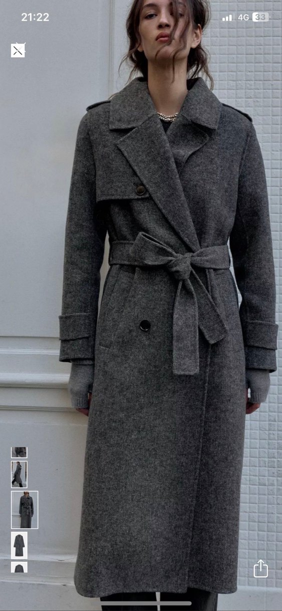 Kemerli ve çift düğmeli gri uzun kaban, klasik ve sıcak bir dış giyim seçeneği sunar.