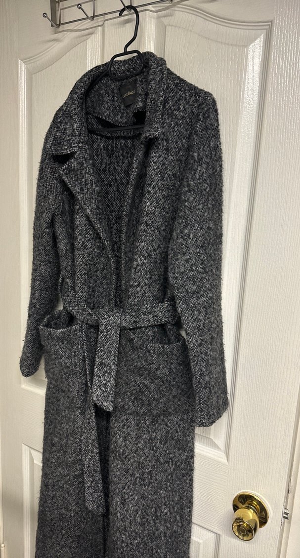 Kemerli ve büyük cepli, dokulu ve sıcak tutan gri uzun kaban. S beden az kullanıldı defosu yok