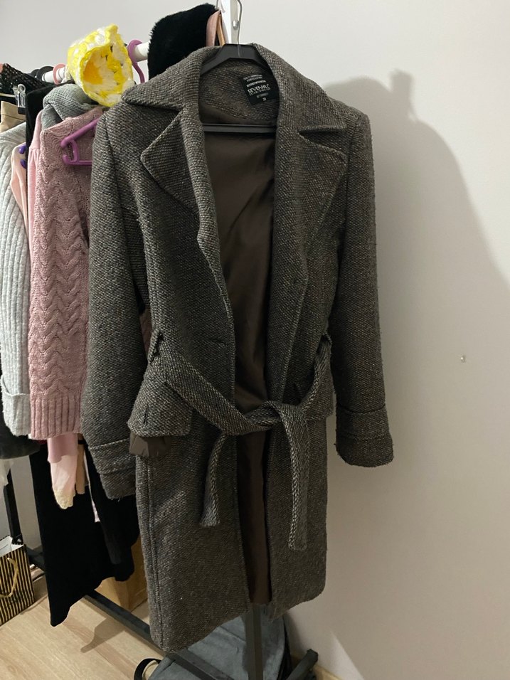 Kemerli ve yakalı, gri dokulu kumaştan uzun kaban. İç kısmı astarlı, rahat kullanım sağlar. 36 giyiyorum bana oluyo