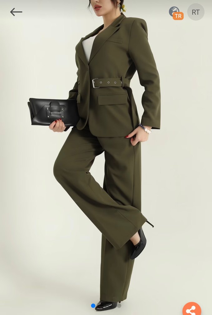 Kemerli Haki Deri Kadın Takım Elbise