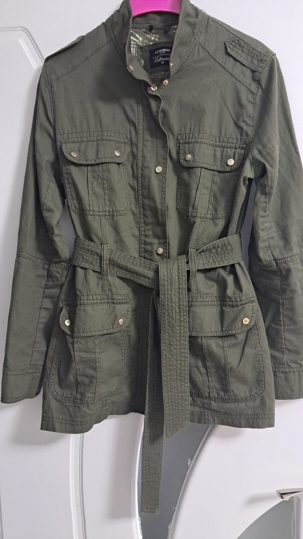 Haki renkli pamuklu ceket, kesik yaka, uzun kollu ve kemerli bel ile dar kesim sunar. Çoklu cepleri ve midi boyu ile günlük sokak stili için uygundur.