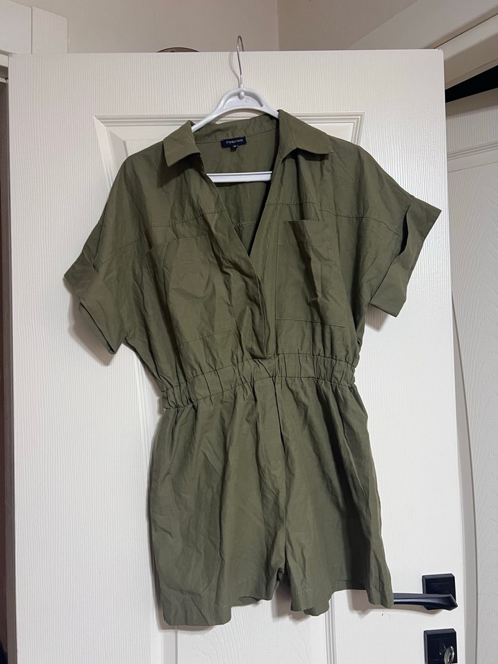 1 kez kullandım Kemerli bel, kısa kollu ve yakalı tasarıma sahip, rahat kesim haki renk keten kumaştan kadın kısa tulum. Günlük sokak stili için uygun.