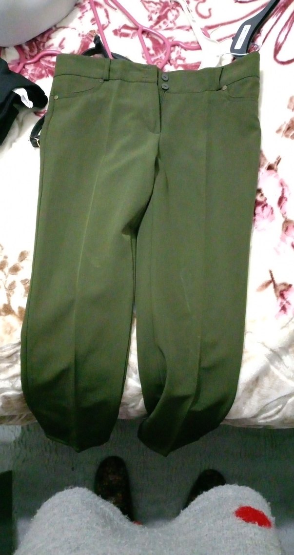 Kemerli bel, midi boy ve bol kesim haki kumaş pantolon. Ofis ve günlük kullanıma uygun, ipeksi dokuda.