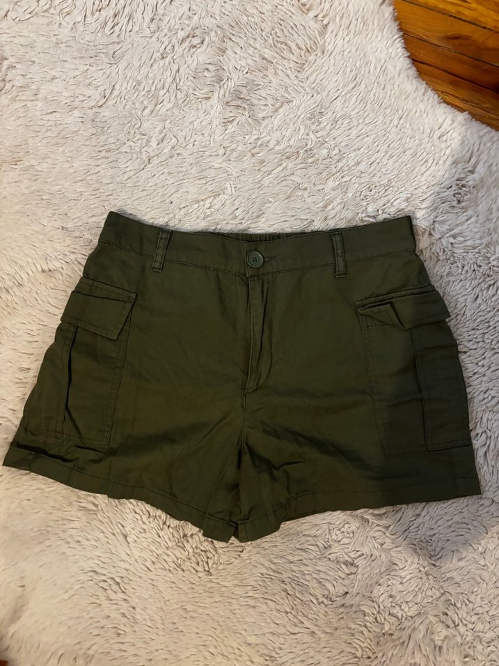 Kemerli, bol kesim haki kadın mini şort. Rahat ve nefes alan kumaştan, yan cepli, günlük açık hava kullanımı için uygundur.