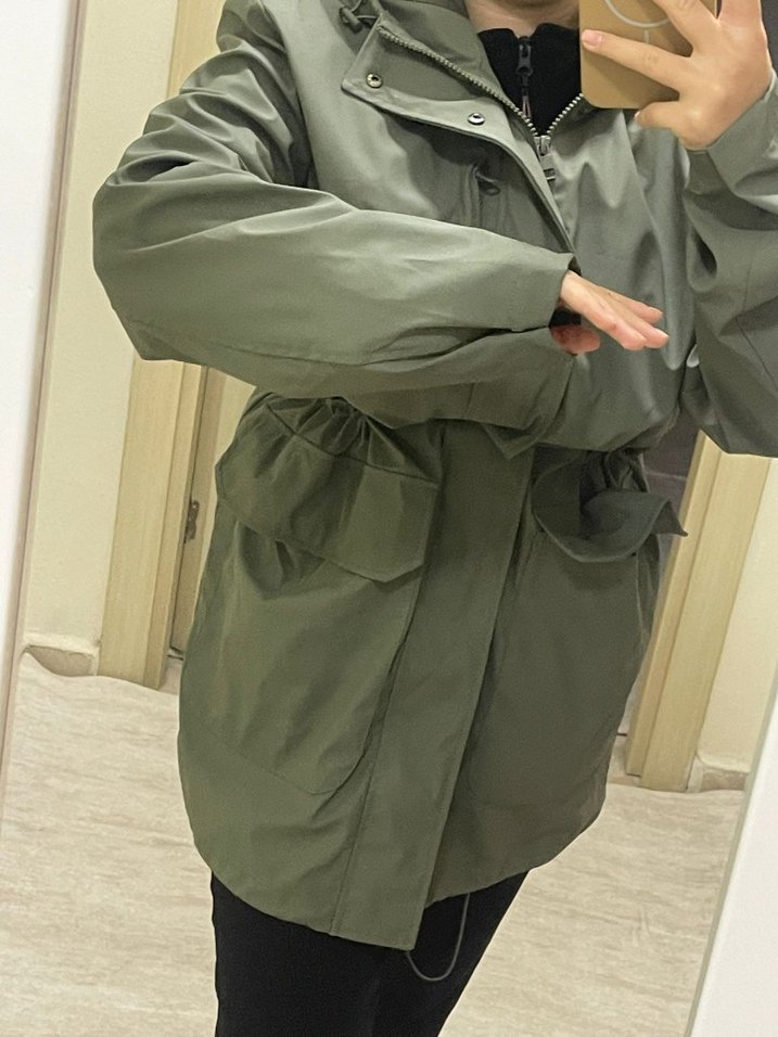 Kemerli, uzun kollu ve yüksek yakalı haki parka. Sentetik kumaştan, kamuflaj desenli, rahat kesim, günlük sokak stili için uygun.