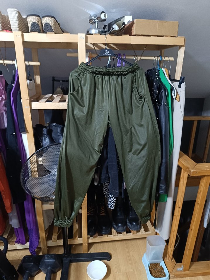 Kemerli bel, midi boy ve koyu yeşil renkte, sentetik kumaştan rahat kesim kadın pantolon. Sokak modası ve athleisure tarzına uygun.