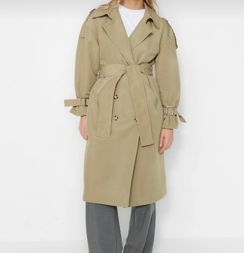 Kemerli, uzun kesim haki trençkot, notalı yaka ve uzun kolludur. Rahat kesimi ve sentetik kumaşıyla günlük kullanıma uygundur.