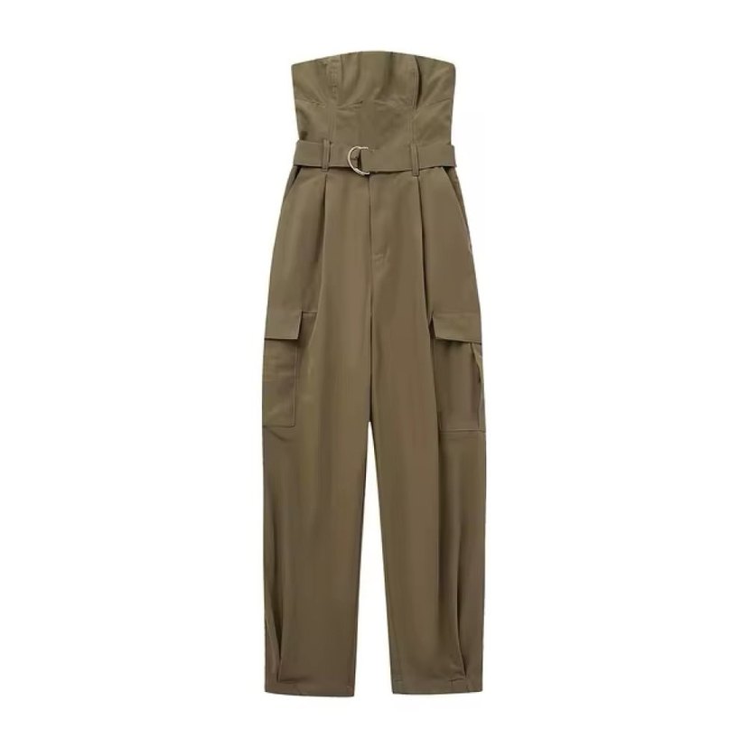Kemerli, askısız ve kolsuz, sentetik kumaştan yapılmış kadın tulum. Rahat kesim ve uzun boy ile minimalist, desensiz tasarım sunar.