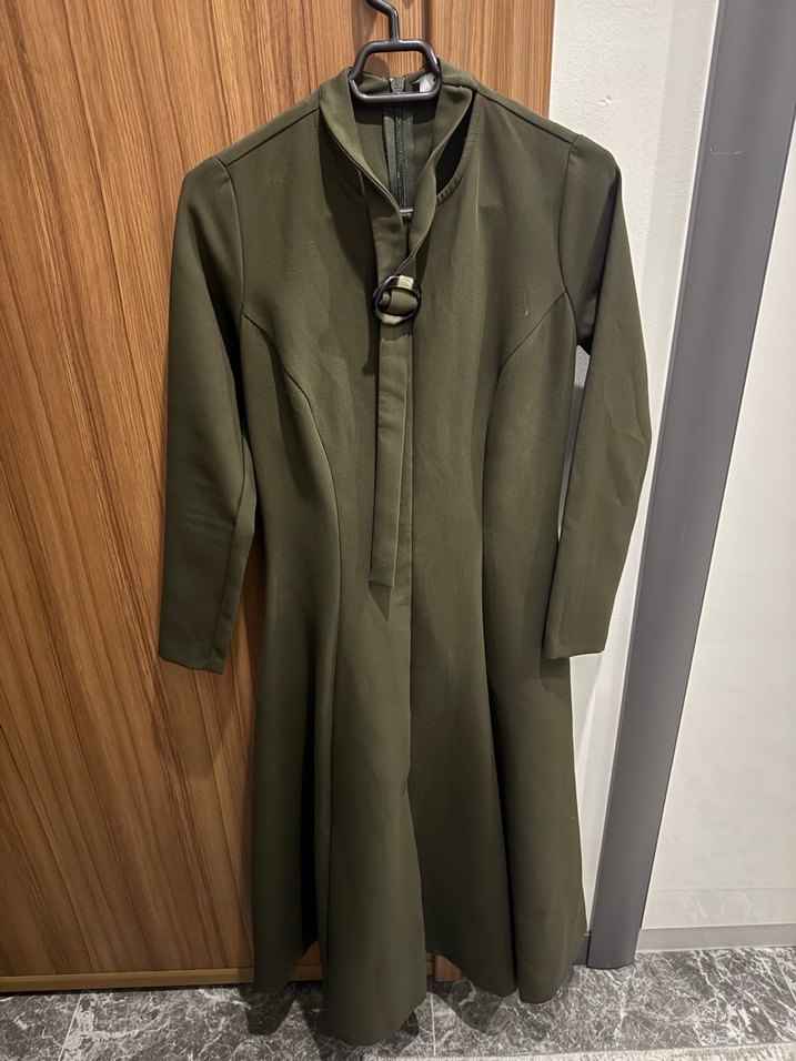 Kemerli bel ve çentikli yaka detayına sahip uzun haki kadın kabanı. Uzun kollu, regular fit ve sentetik kumaştan, hafif kamuflaj desenli, ofis için uygun Paris tarzı sokak giyimi.