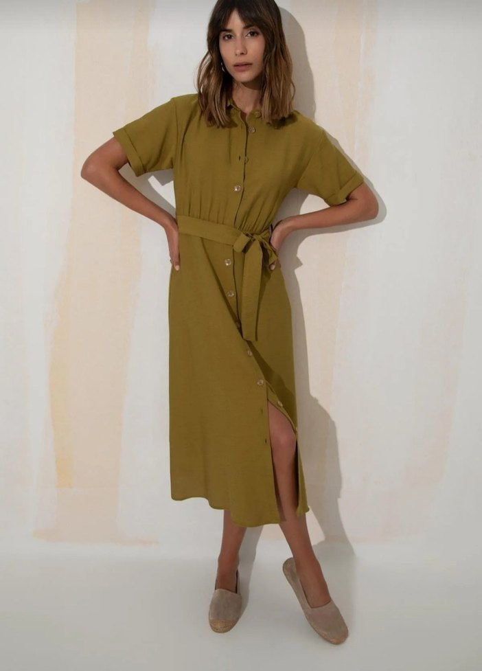 Kemerli, kısa kollu, kayık yaka uzun khaki keten elbise. Hafif kumaş ve rahat kesimiyle günlük şıklık sağlar.
