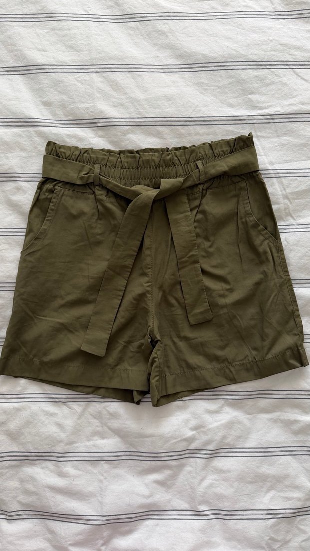 Kemerli bel ve rahat kesimiyle haki renk keten mini şort, günlük dış mekan kullanımı için uygundur.