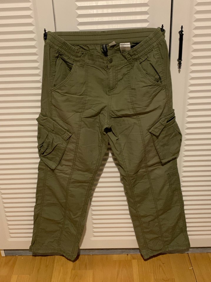 Kemerli, midi boy, bol kesim haki keten pantolon. Cepli ve sokak tarzı, açık hava kullanımı için uygun.