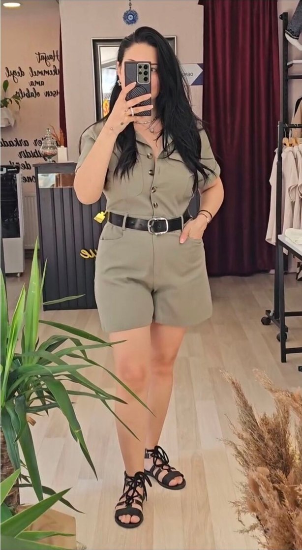 Kemerli, haki renkli, kısa kollu ve yaka detaylı, bol kesim kadın tulumu. Günlük rahat kullanım için uygundur.