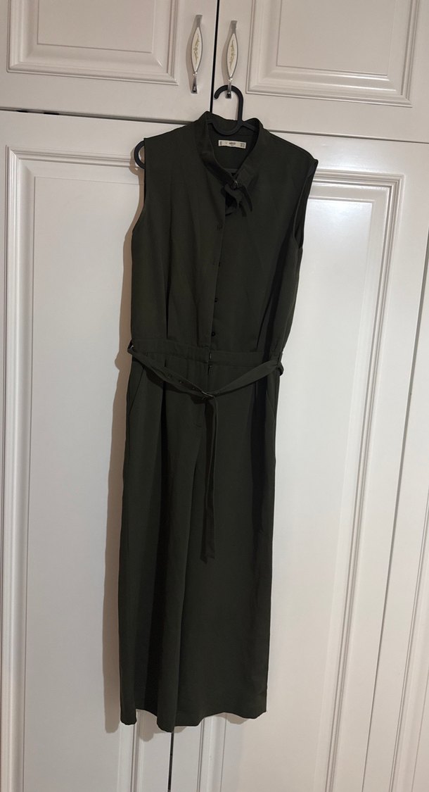Kolsuz, kemerli tulum, notched lapel yakaya sahip. Uzun boyu ve minimalist stiliyle ofis veya sokak giyimine uygun.