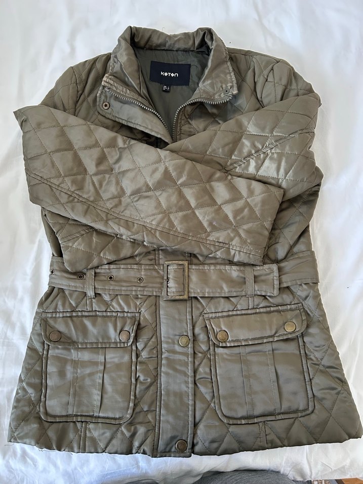 Haki kemerli, kapaklı cepli, normal boy kadın ceket. İnce, fitted kesim ve günlük kullanıma uygun.