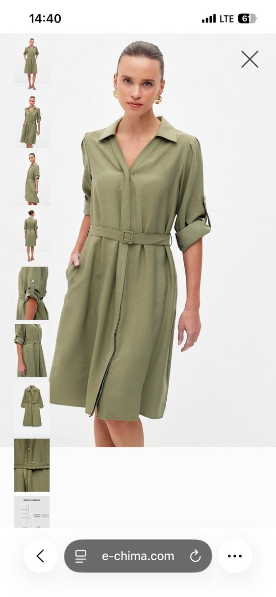 Hafif haki renkli bu midi elbise, kemerli bel ve yakalı tasarımıyla rahat bir kesim sunar. Sentetik, yumuşak dokulu kumaştan yapılmıştır ve ofis için uygundur.