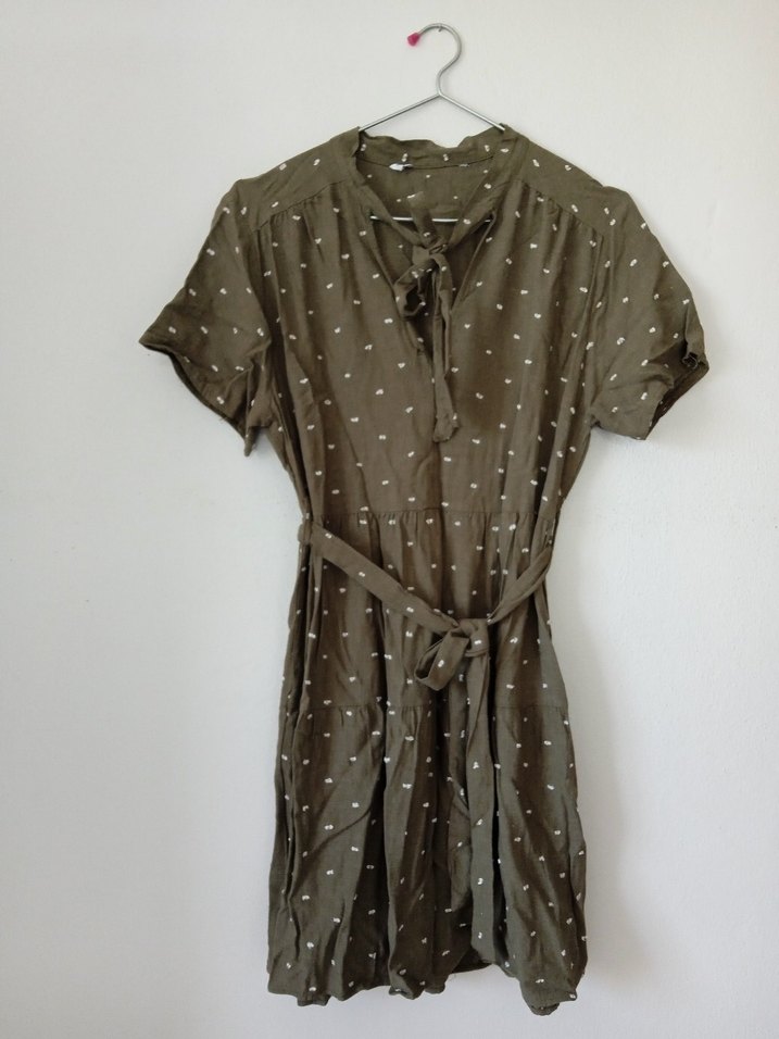 Keten kumaştan yapılmış, V yaka, kısa kollu, kemerli ve bol kesim haki midi elbise. Günlük kullanıma uygun bohem tarzda. 36-38 bedene uygundur
