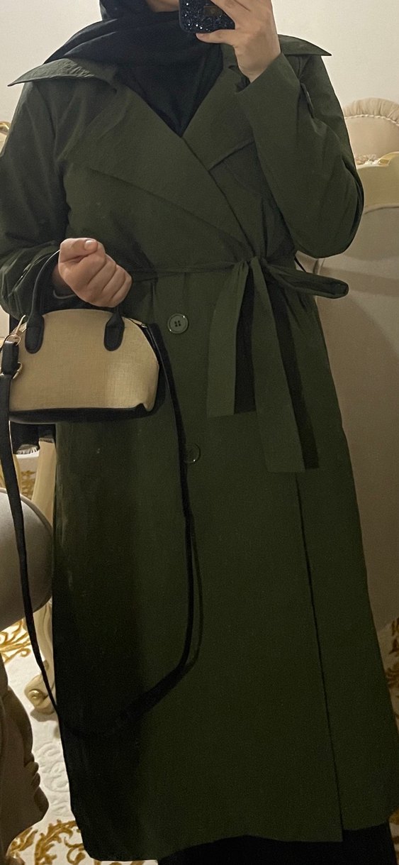 Haki midi trençkot, kesik yaka ve askılı kollarıyla kemerli, bol kesim tasarımıyla rahat ve şık. Sentetik kumaştan, günlük sokak stili için uygun. 38,40,42 beden uyumlu