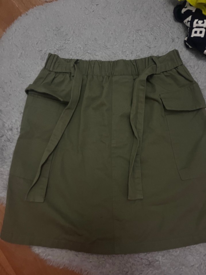 Kemerli, bol kesim ve haki renkte olan bu mini etek, sentetik kumaştan üretilmiştir. Sokak stili ve açık hava etkinlikleri için uygundur.