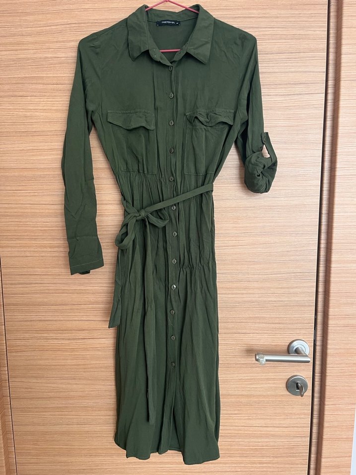 Kemerli bel, uzun kollu, yaka detaylı haki uzun gömlek elbise, rahat ve günlük kullanıma uygun. Midi boyda sayılı kullanıldı