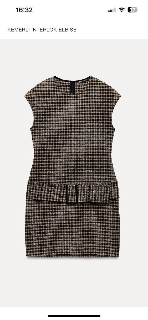 Stokları bulunmayan kemerli ve kolsuz, camel ve siyah tonlarda ekose desenli mini elbise. Günlük kullanım için uygun şık bir model.